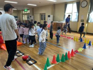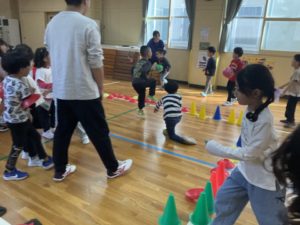 ゲームが始まると、年長さんが年少・年中さんにボールを譲ってあげる場面もあり、優しさがあふれる時間に😌