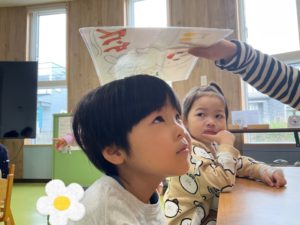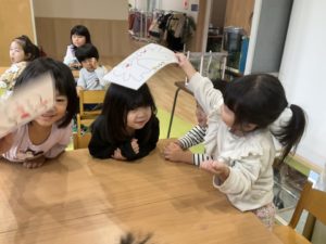 下敷きを使って頭をこすると…髪の毛が浮いてくる!「うわぁー!」と驚きの声が聞こえてきました☺️1人でこするのが難しく、お友達と協力し合いながら実験を成功させる姿が見られましたよ👀✨「頭貸してください〜」とお友達の頭でやる時には、しっかり了承を得てから行う、年少さん☺️「いいですよ〜次は頭貸してくださいね〜」と交互に行う約束もしていました😄