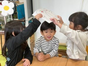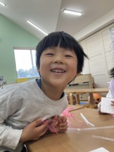 スズランテープを細かく割き、ティッシュを使って電気を溜めると、ふわふわのスズランテープになったり、頭や体に引っ付いたり!体全身を使って楽しむ子どもたちでした💫