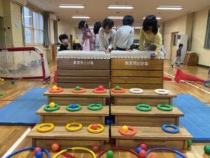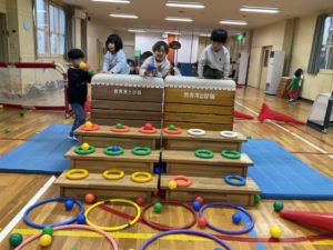 ゆっくり落としてみたり、あえて投げてみたりと、子どもたちは自分なりに工夫しながらさまざまな方法を試していました。リングに入った瞬間には、お友達と嬉しそうにハイタッチする姿も☺️
