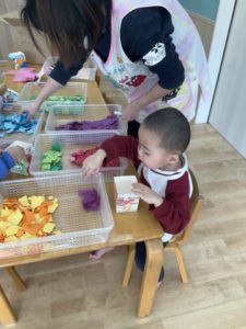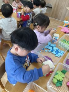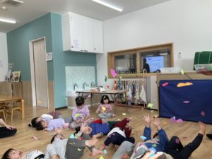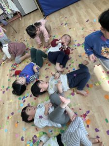 余った画用紙をパラパラ降らせて楽しく遊びました😆きらきら組のお友だちも一緒に楽しく遊びました!